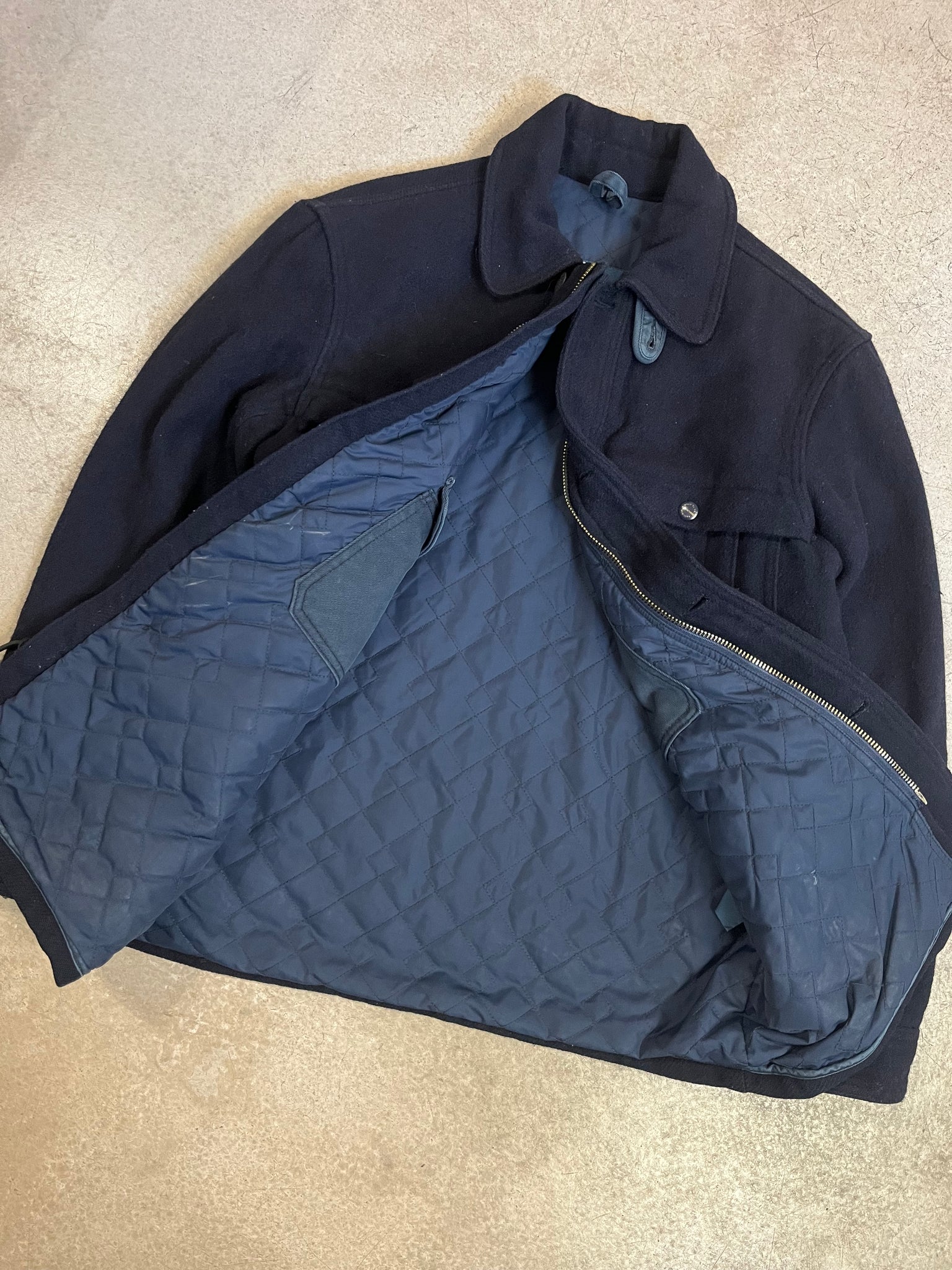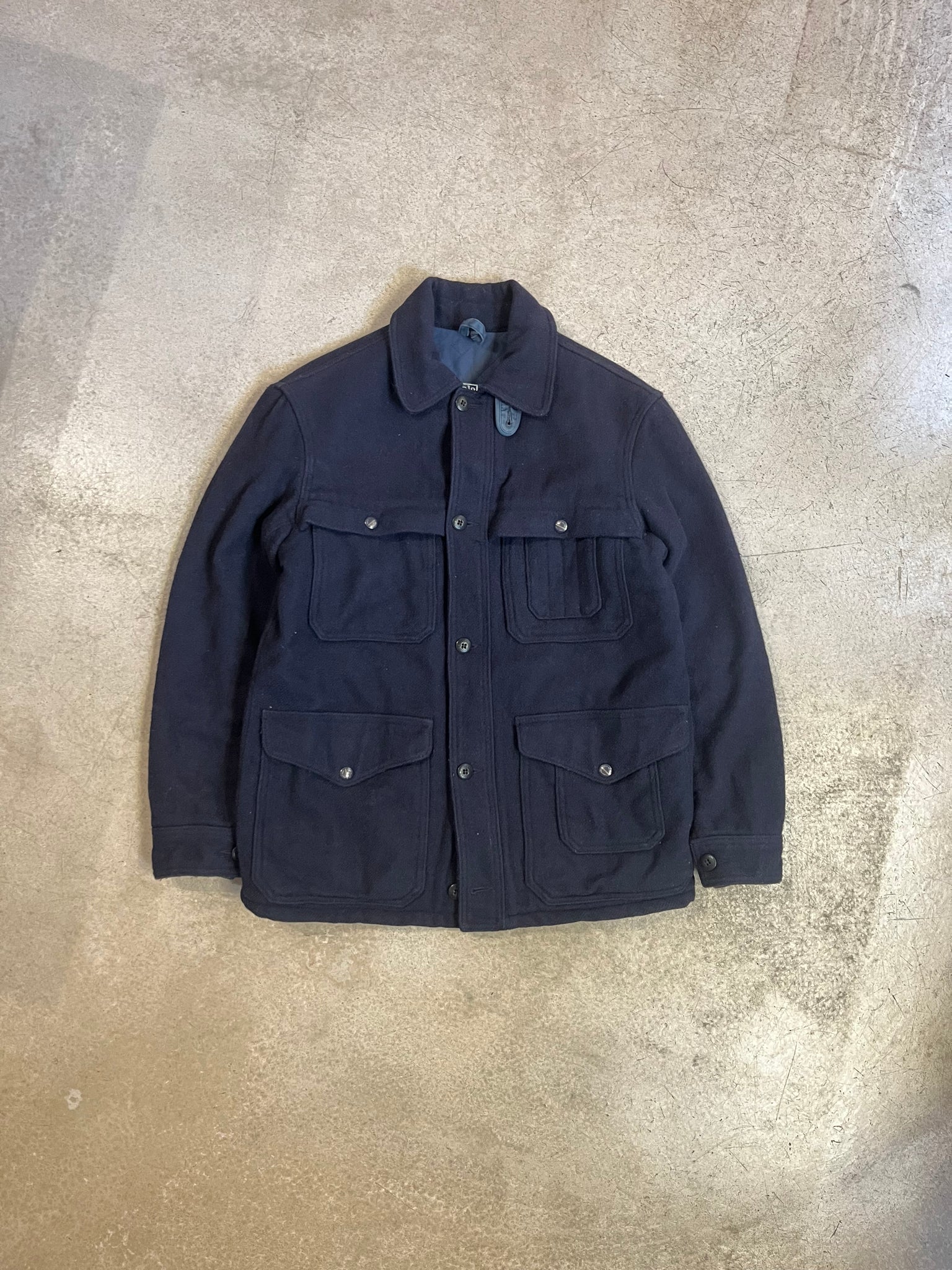 Blouson composé à 85% de laine de la marque Ralph Lauren. Il s'agit d'un modèle inspiré des traditionnelles vestes de chasse et il est donc équipé de nombreuses poches dont une gibecière.