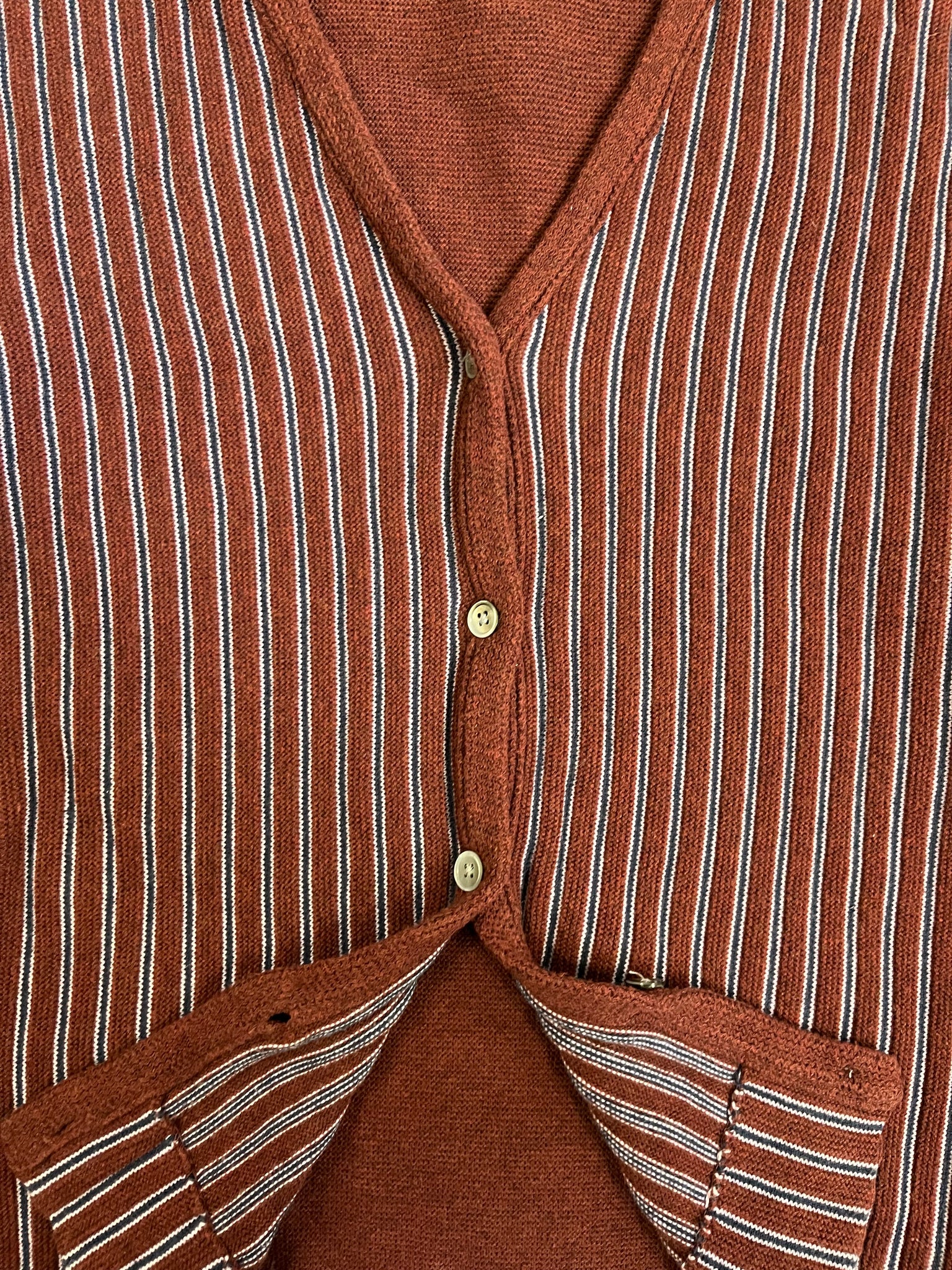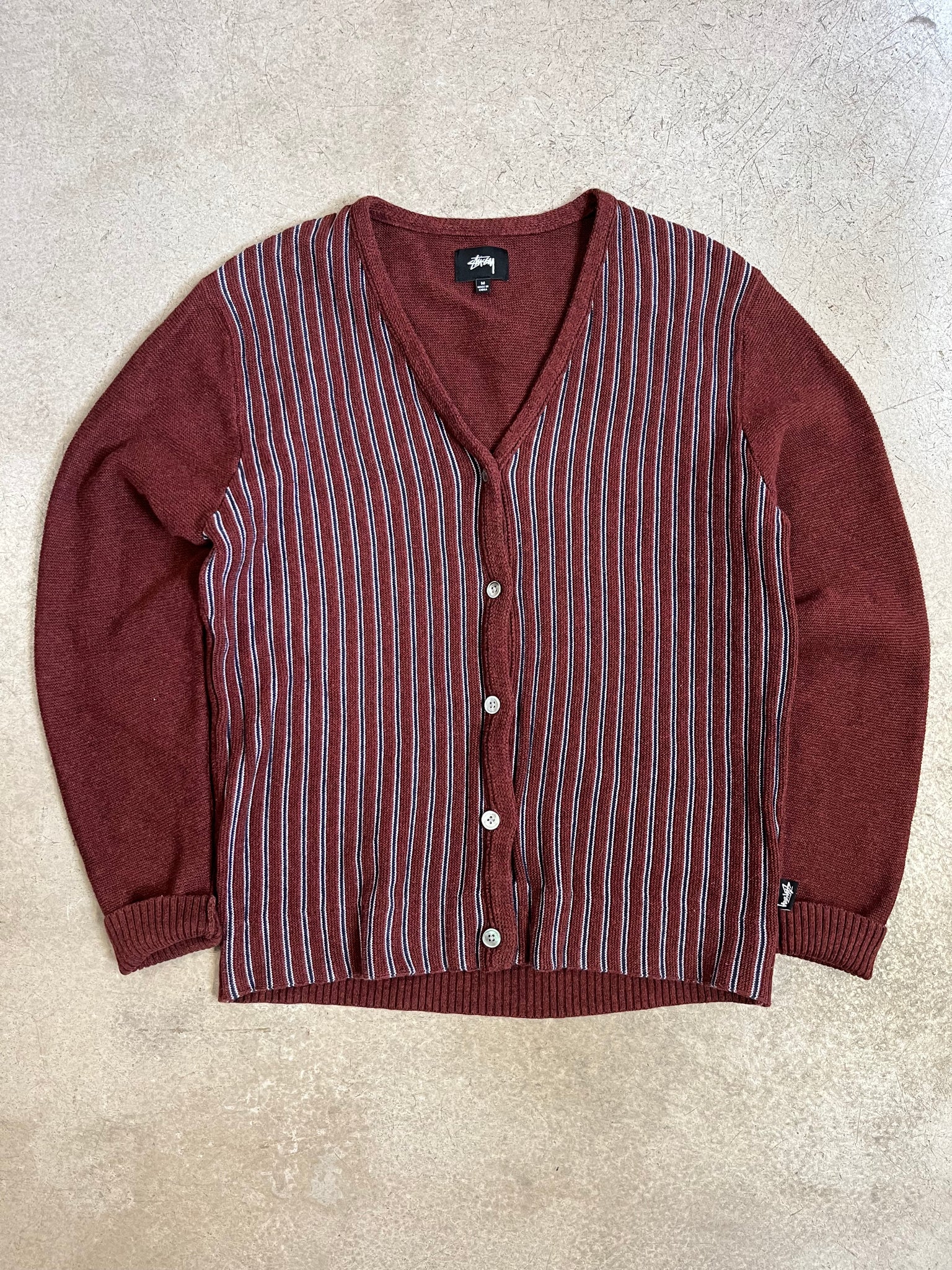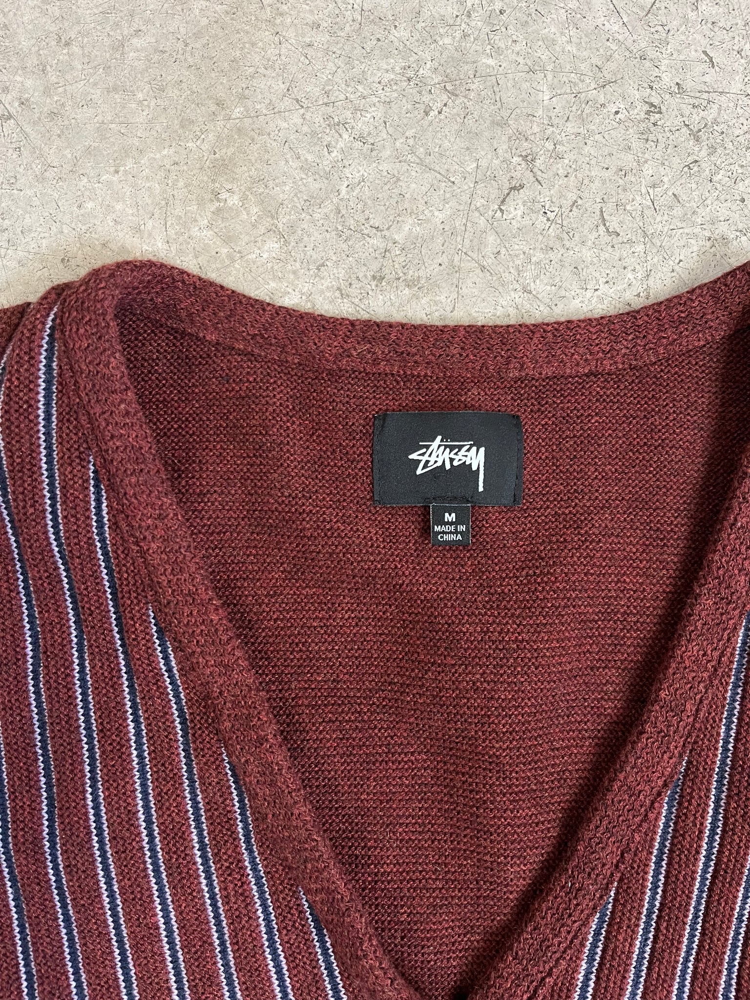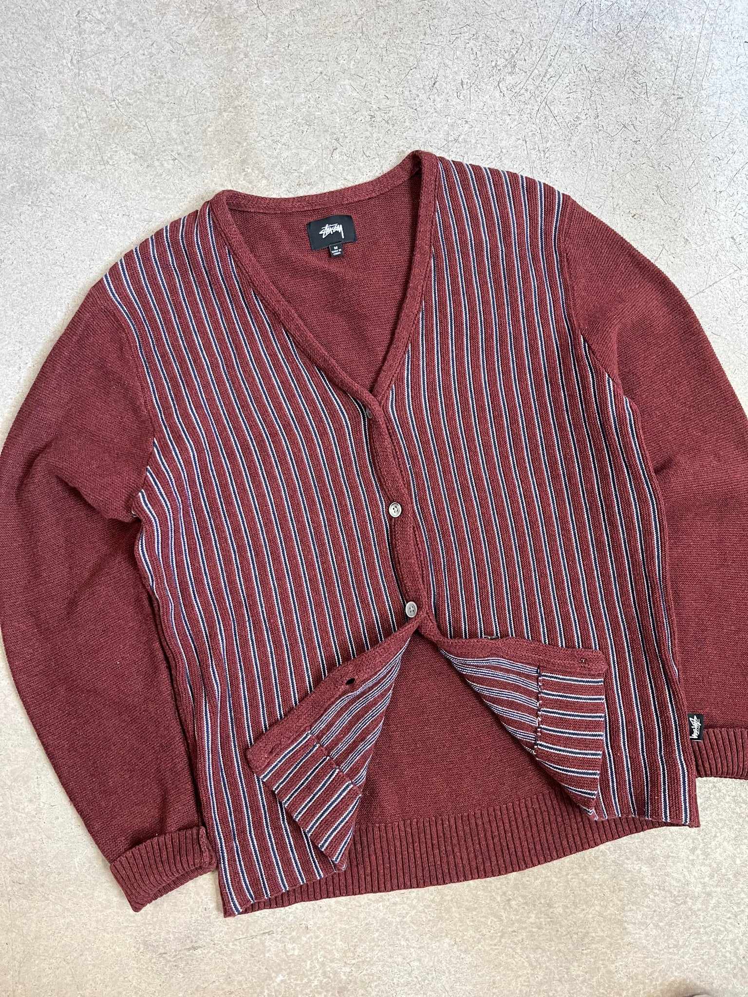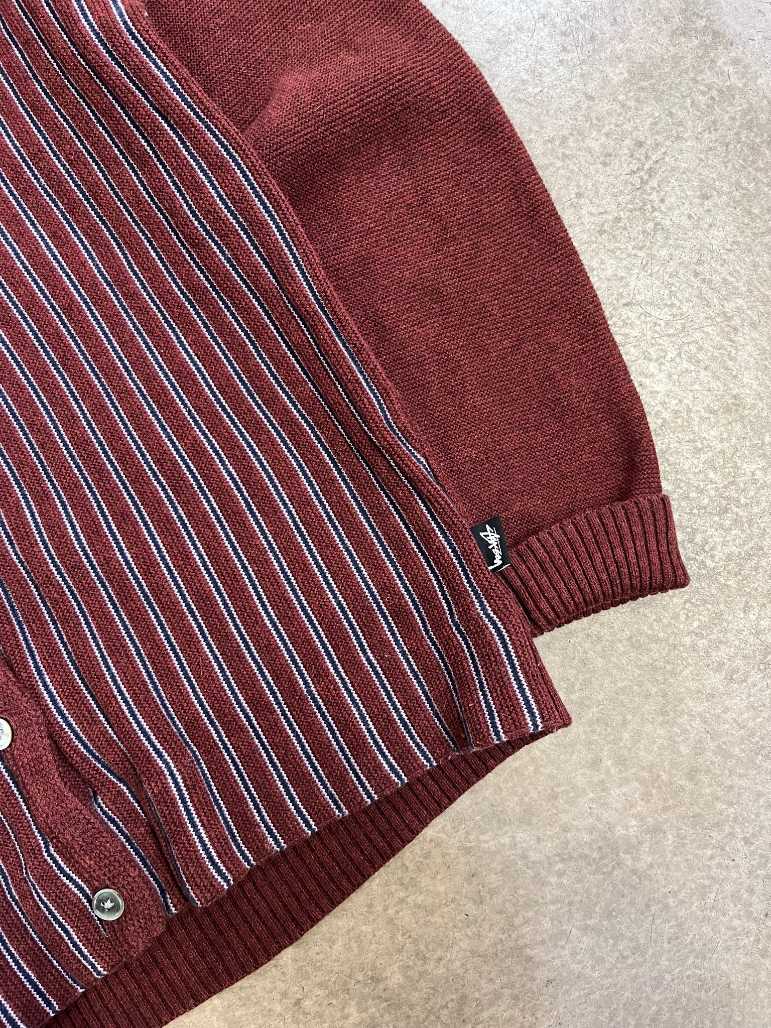 Cardigan de couleur bordeaux à rayures, de la célèbre marque Streewear "Stussy".