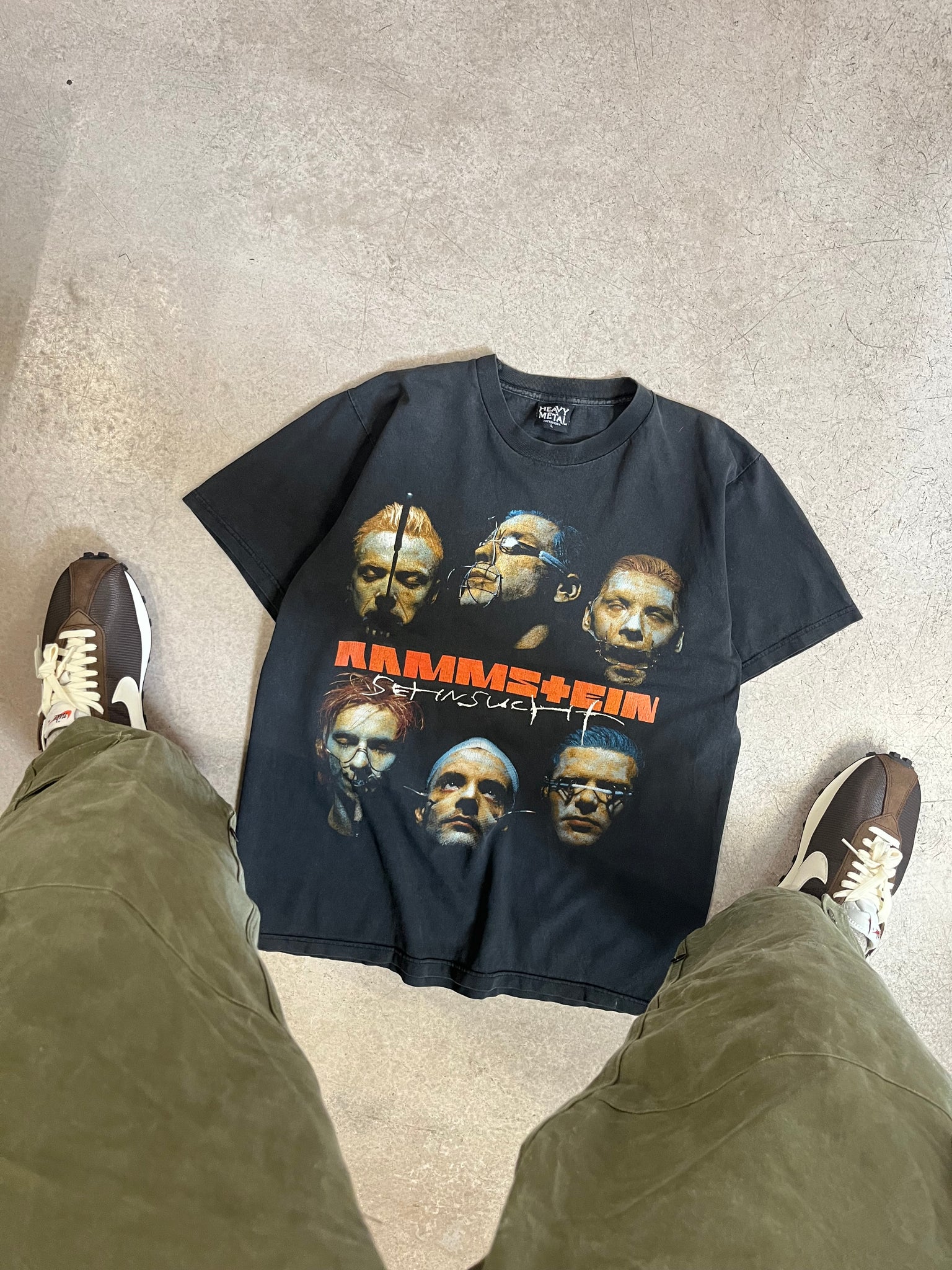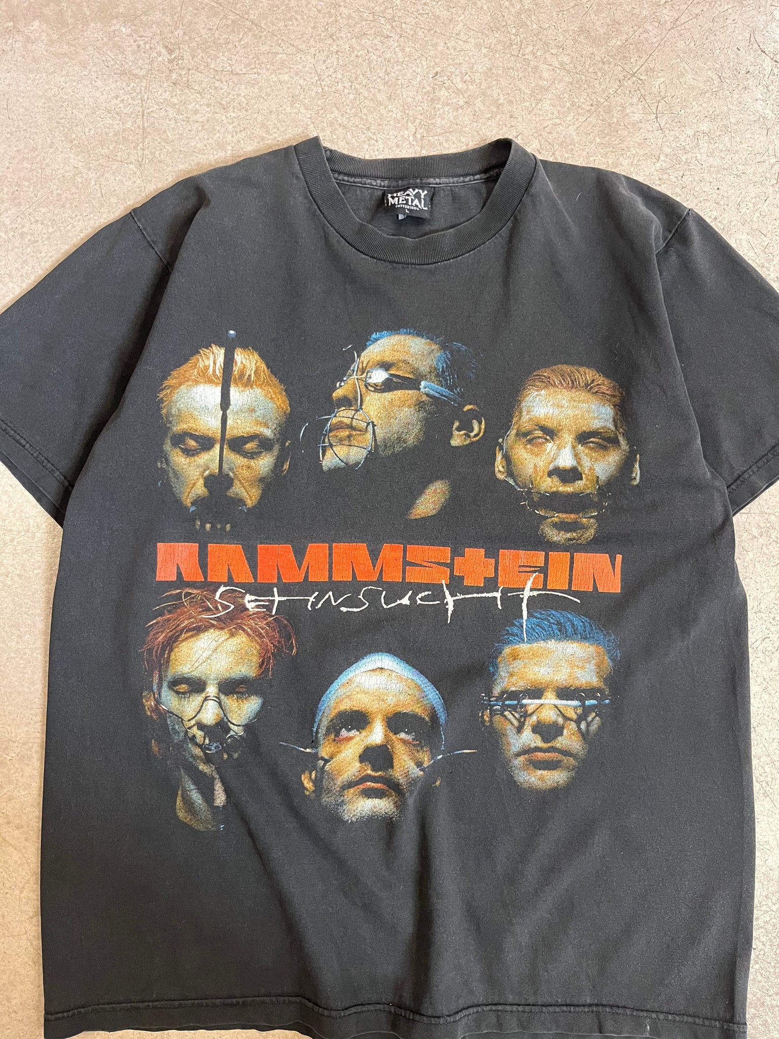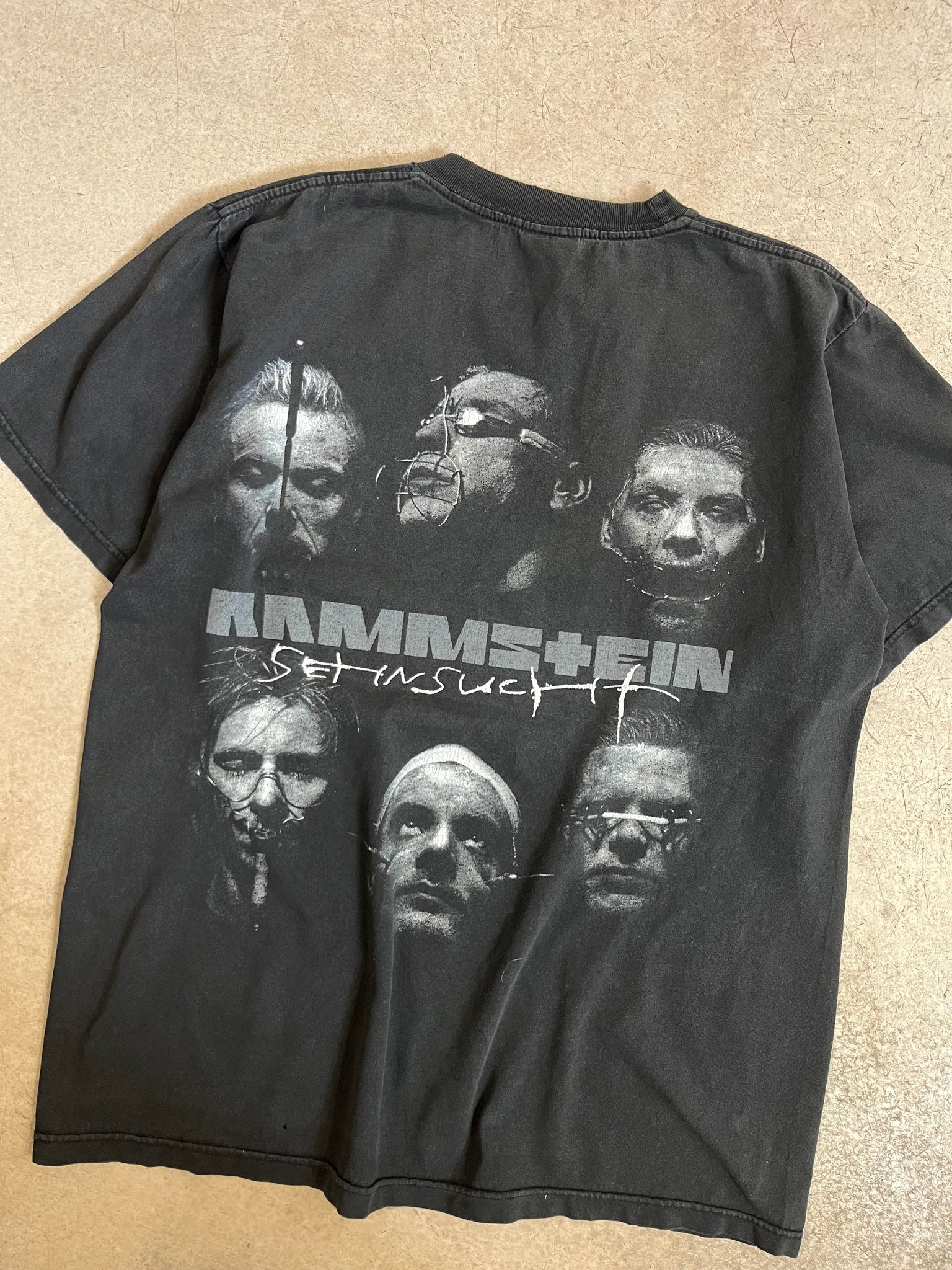 Tee-shirt vintage Rammstein à l'effigie de leur second album "Set in sucht" sortie en 1997. Print coloré sur le devant et même print en noir et blanc dans le dos. Très beau fade créé par les années d'utilisation et de lavage.
