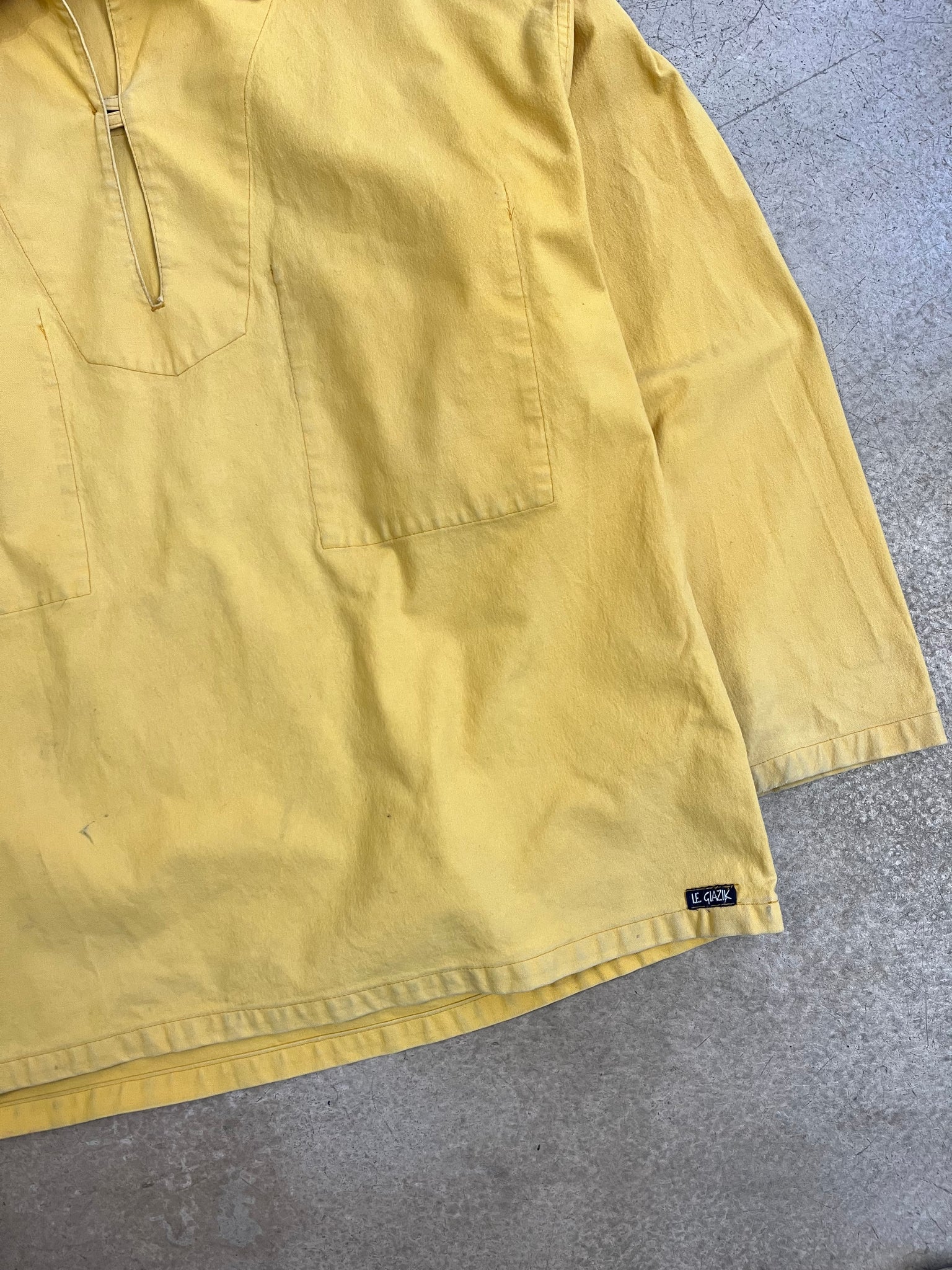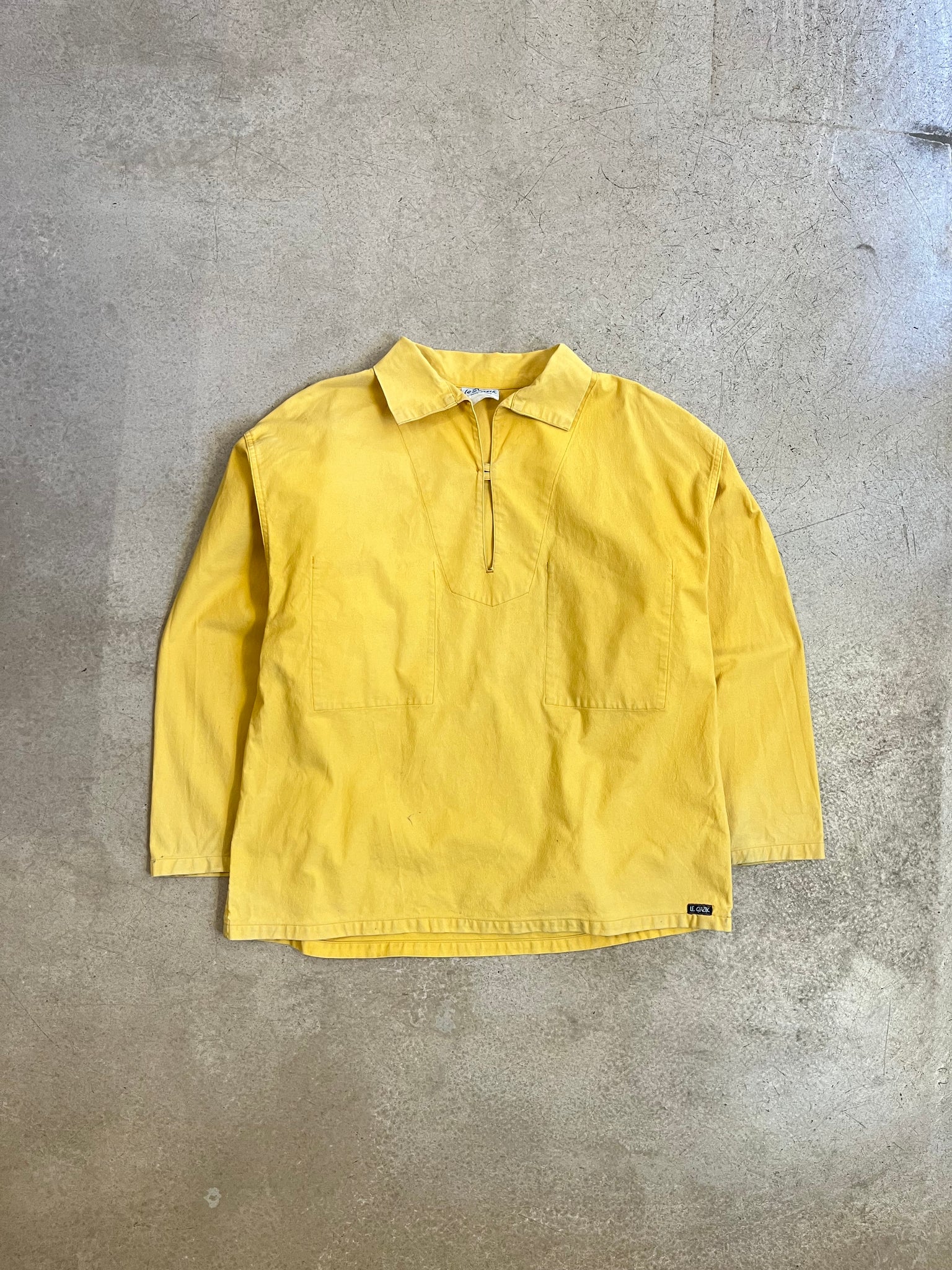Vareuse couleur jaune de la marque "Le Glazik" spécialisée dans les vêtements marins. La couleur s'est légèrement estompée avec le temps ce qui donne un fade magnifique et très tendance. La vareuse possède également quelques traces çà et là puisque c'est originellement un vêtement de travail.