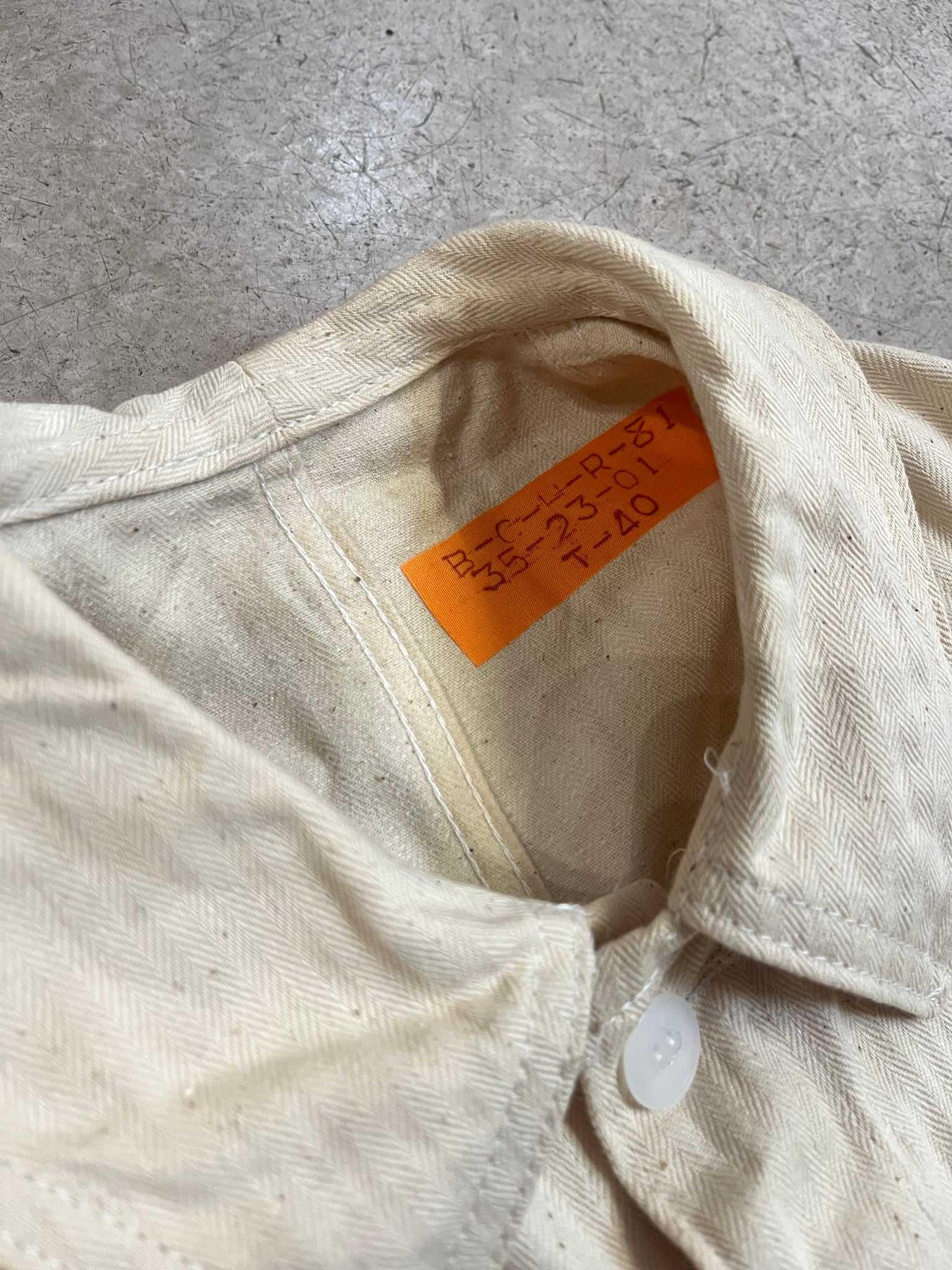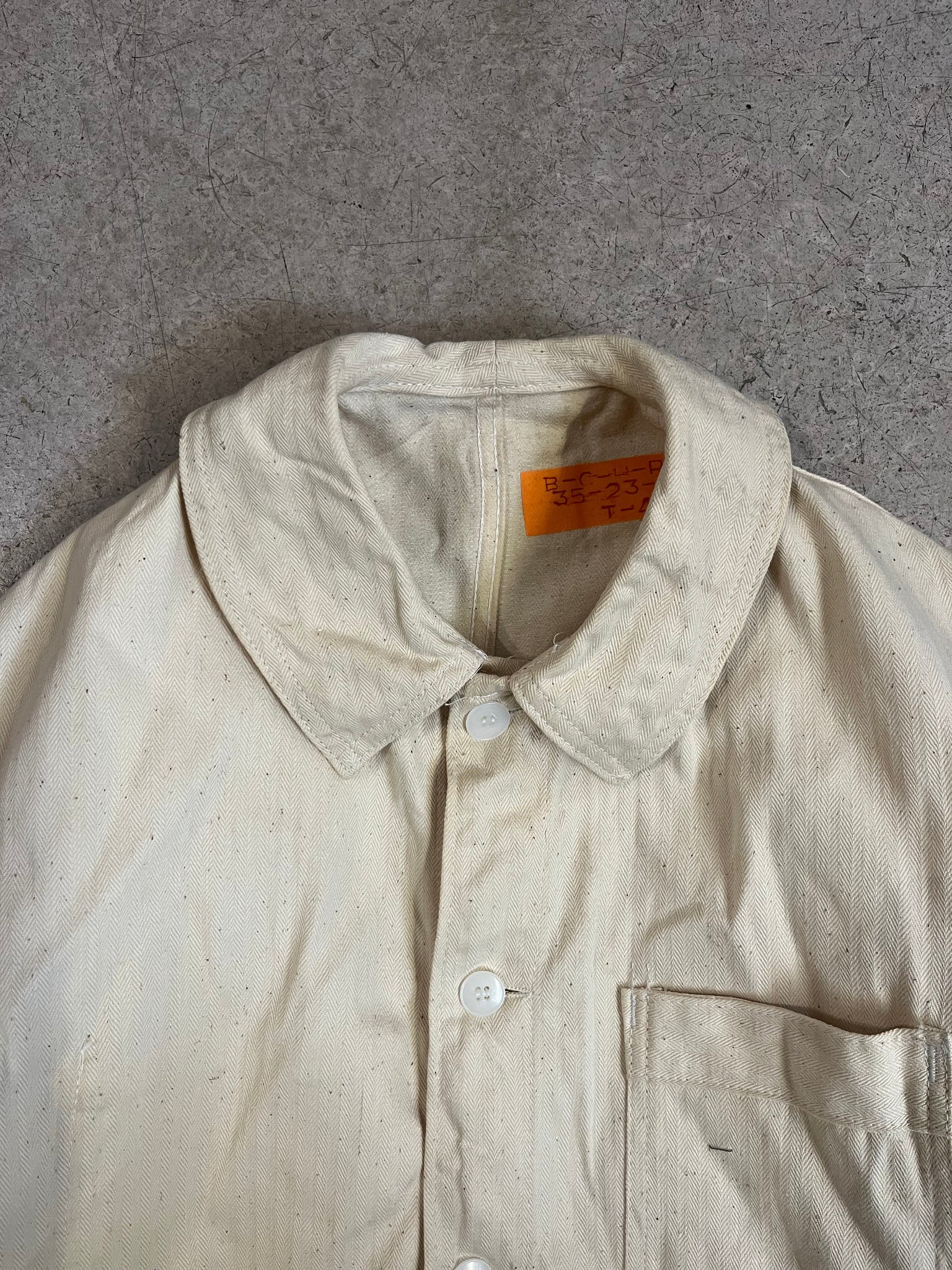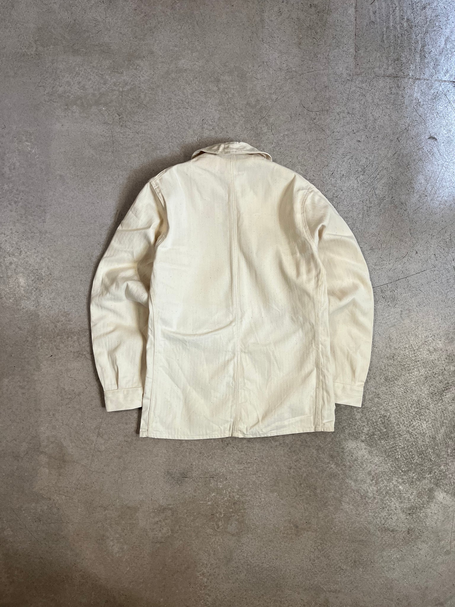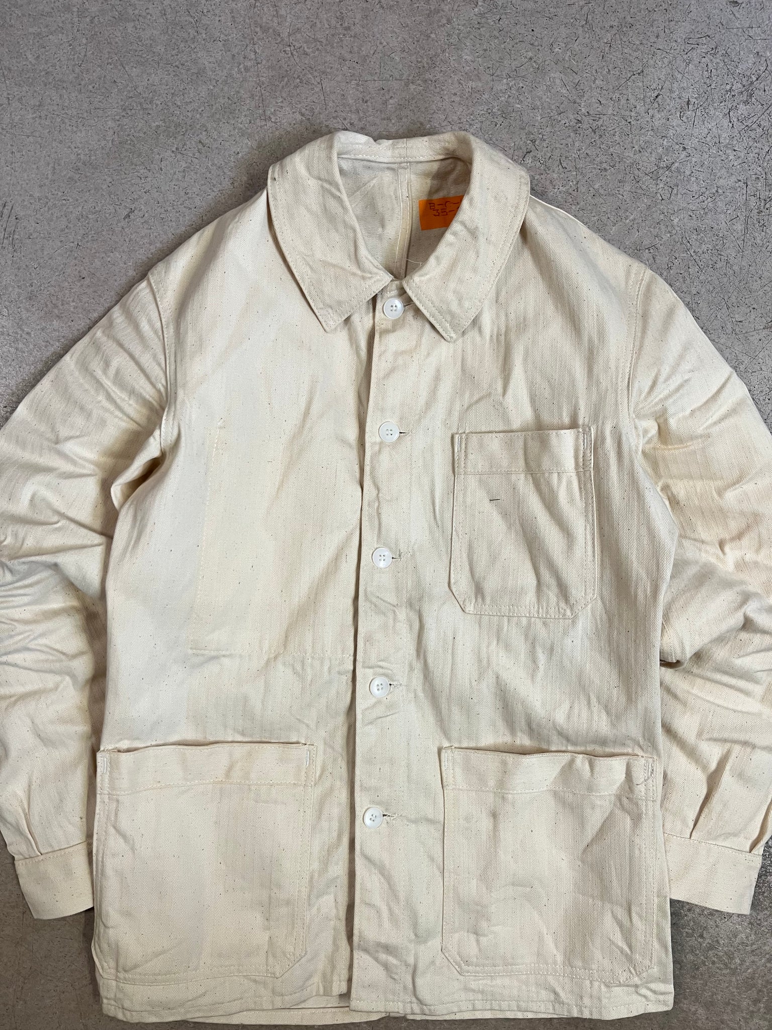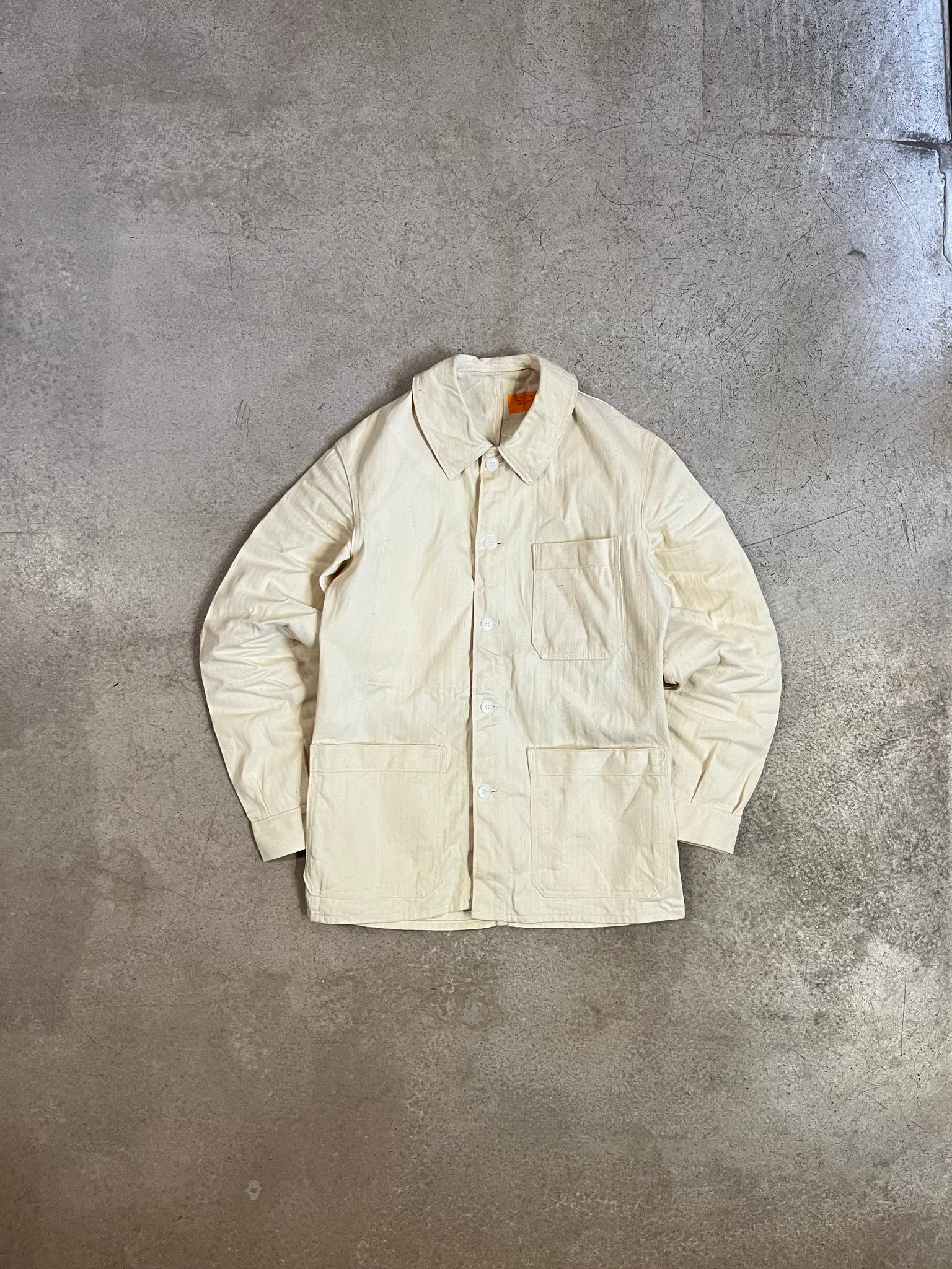 Veste de travail vintage à chevrons et de couleur crème. Il s'agit d'un modèle neuf de stock. Mais puisqu'elle comportait des traces de stockage, nous l'avons lavée.
